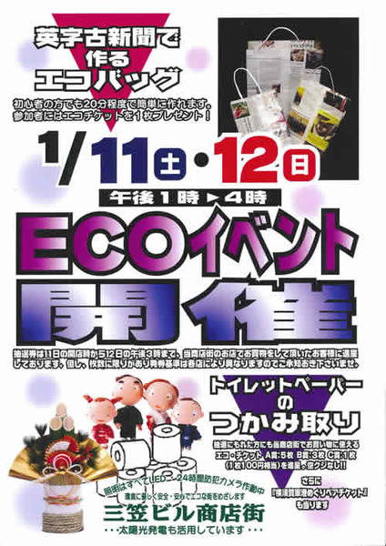 ■■■■■■■■■■■■■■■■■■■■■■■■■■■■■■■■ ★日時:1月11日(土)・12日(日)、両日とも午後1時〜4時 会場:三笠ビル商店街 旧さいか屋大通り館側入り口 1)『トイレットペーパーつかみ取り抽選会』 イベント当日、当商店街でお買い物をしていただいたお客様に“つかみ取り抽選会” の参加券をお渡しします。 抽選券1枚につき1回のガラポン(福引き)ができます。 “つかみ取り”は、トイレットペーパーが詰まった大きな箱から隣に設置した空箱へ 移すだけ。 移動できたペーパーはすべてお持ち帰りいただけます。 参加していただくガラポンは “空くじナシっ!” 惜しくもつかみ取りチャレンジにもれた方には、当商店街で買い物に使えるエコ・チ ケット(1枚100円相当)を A賞:5枚、B賞:3枚、C賞:1枚のほか、人気の観光クルーズ『横須賀軍港めぐり』の チケットもペアで当たります。 ※抽選券は11日(土)の開店時から12日(日)の午後3時まで、各店で配布(配布基 準は店舗により異なります)。 2)『英字の古新聞を利用したエコバッグ講習会』 参加費は無料。 参加していただいた方全員に、商店街でお買い物に使える“エコ・チケット”を1枚 (100円相当)進呈させていただきます。 講習会に初めての方でも20分前後で完成できます。 英字古新聞を再利用したちょっとおしゃれなエコバッグ、ふるってご参加ください。 ※荒天中止。 ■■■■■■■■■■■■■■■■■■■■■■■■■■■■■■■■