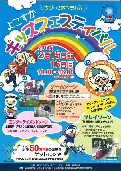 ≪ゲームゾーン≫≪エンターテイメントゾーン≫≪プレいゾーン≫ 3会場で、お子様を対象とした、楽しいイベントを開催します! ぜひご参加ください!! 日時:2014年2月15日(土)16日(日) 10:00〜16:00(荒天中止・小雨決行) ≪ゲームゾーン≫ 会場:横須賀市役所前公園 参加費:100円 横浜Fマリノスグッズ&ガラポン参加券をもれなくプレゼント! ★キックターゲット ★元巨人軍・山本選手のストラックアウト ★スナックゴルフ ★輪投げ 等 ※対象年齢:小学生まで ≪エンターテイメントゾーン≫ 会場:三笠通り・かながわ(旧三浦藤沢)信用金庫本店前 ★大道芸 ★ダンス ★ミュージック ≪プレいゾーン≫ 会場:横須賀中央駅前Yデッキ下 ★ミニ電車に乗っちゃおう!※小学生低学年まで ★新しい横須賀のゆるキャラに君だけの色を塗っちゃおう! <<<<<ゲームで総額50万円分の金券をゲットしよう!>>>>> ★空くじなし ★100円以上の金券が必ず当たる! <主催>ヨコスカダウンタウンクラブ <後援>横須賀市 <協賛>大滝商店街、三笠ビル商店街、千日通商店街、若松商店街、若松永和会商店街 【お問合せ】ヨコスカダウンタウンクラブ事務局 TEL:070-5546-0345
