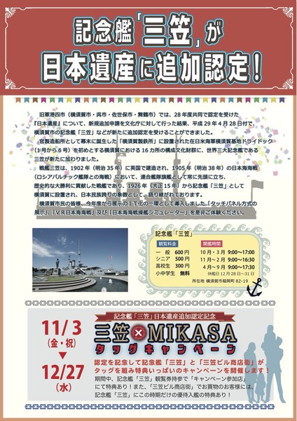 お待たせいたしました〜昨日から 横須賀集客促進実行委員会、三笠保存会、三笠ビル商店街共同開催のイベント「三笠×MIKASA タッグキャンペーン」が始まりました。 記念艦三笠の日本遺産追加認定を記念してのイベントで、記念艦三笠を再度見つめる機会をつくることと、日本遺産を知ること、そして横須賀中央に来ていただき楽しんでいただくことを目的に開催いたします。 まずは第1弾の企画は、記念艦三笠に入艦したお客さまが、その入艦券の半券を三笠ビル商店街の参加店に持ってきてお買い物をしていただければ、それぞれのお店で特別のサービスを受けられます。 また三笠ビル商店街の参加店でお買い物をしていただいたお客様には、期間限定、300円で三笠に入艦できる優待観覧券をしんていいたします。 そして第2弾〜はスタンプラリーなど楽しい企画、勉強になる企画を予定していますので大いに期待してください。