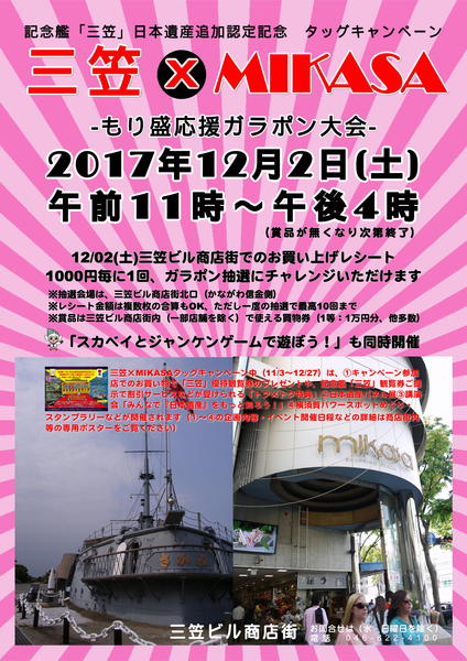 お待たせいたしました。 いよいよ12月2日からスタンプラリーなど始まります。 そこで三笠ビル商店街では、12月2日(土)1,000円でガラポン、スカベイとゲームなど楽しいイベントを計画しました。 今回は特に、Y@カードの協力で、ガラポンに当たるとY@カードのポイントも同時にゲット(ガラポンの金額によりポイントは違います)できる特典があります。 今までカードを持っているお客様にも、そして今回新しくカードを作るお客様にも朗報です。 是非三笠ビル商店街に遊びに来てください〜