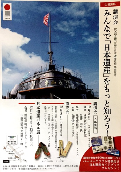 12月2日(土) 『祝・記念艦「三笠」日本遺産追加認定記念』講演会『みんなで「日本遺産」をもっと知ろう』が開催されます。 日時:12月2日(土) 13:00〜15:00 場所:三笠ビル商店街内「地球堂靴店」3階特設会場 講師:横須賀市史資料室 佐藤 明生 氏 定員:先着100名様(当日受付) また日本遺産パネル展も、12月2日〜12月10日まで地球堂1階で開催いたします。 横須賀の歴史を知る上でも貴重な機会だと思いますので、ぜひお越しください。 同時に三笠ビル商店街では、楽しいイベントも行いますのでこちらも楽しみにしてください。